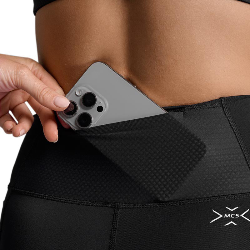 Cintura ligera de tiro alto para esculpir el cuerpo con un ajuste seguro, mientras que un bolsillo trasero de malla para un teléfono y dos bolsillos laterales, uno con cremallera oculta, permiten un fácil acceso mientras estás en movimiento a geles nutricionales, tarjetas o llaves.